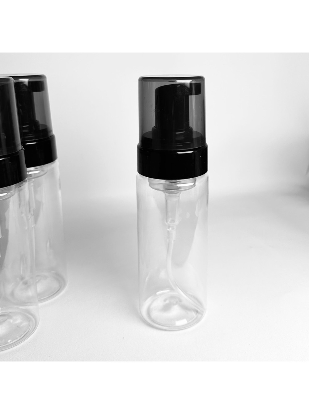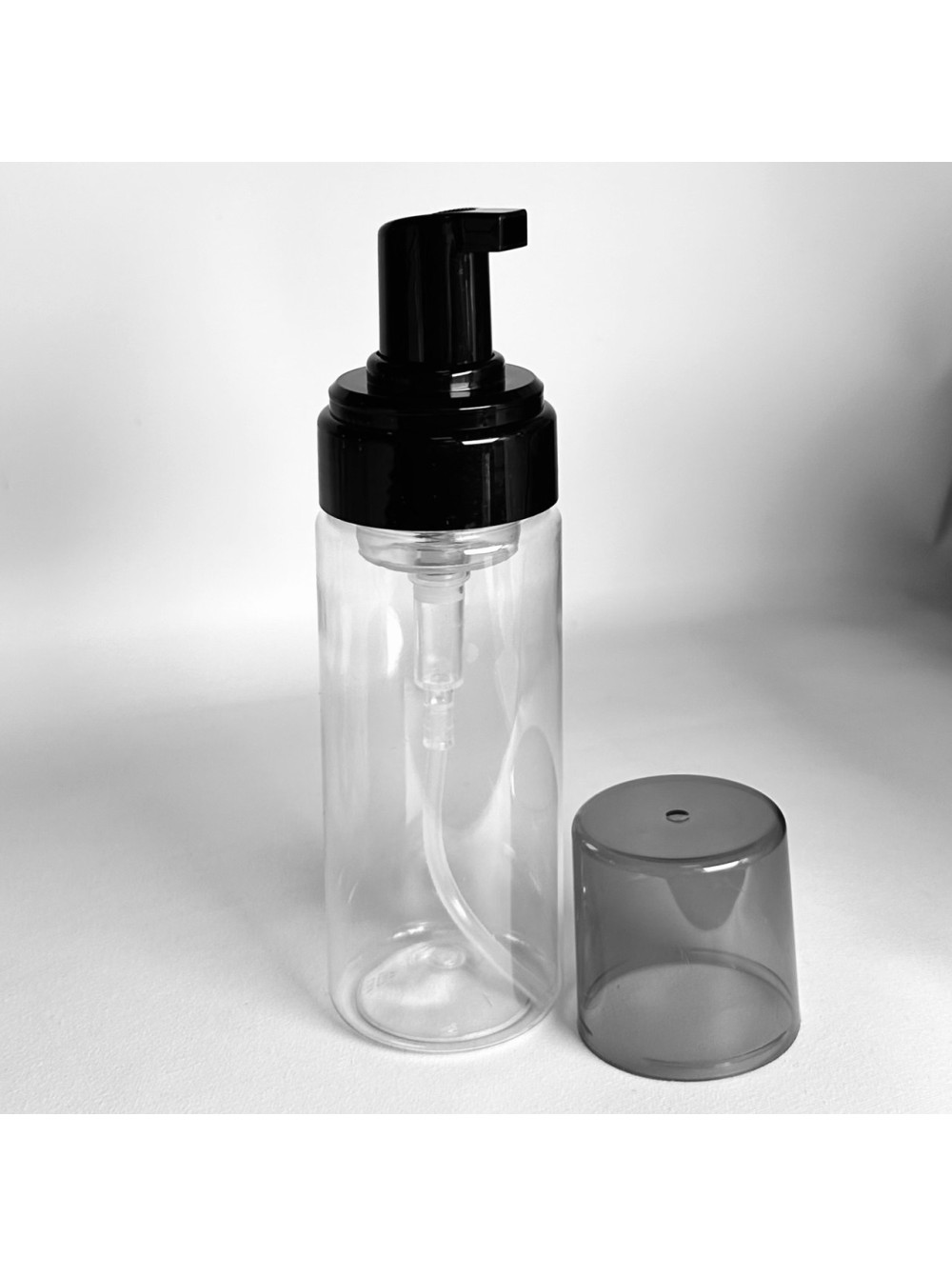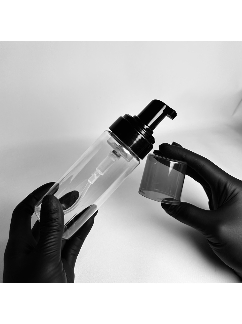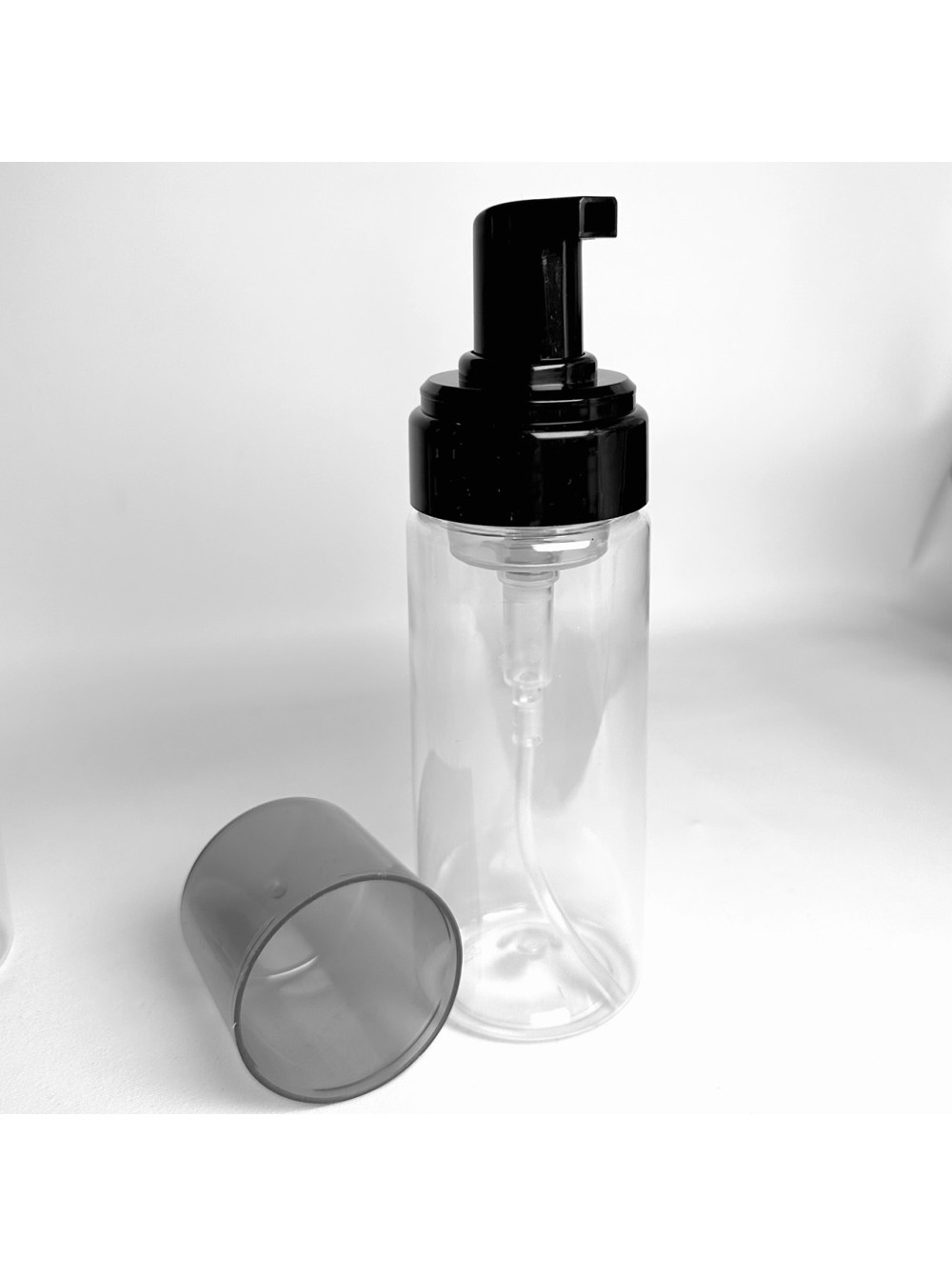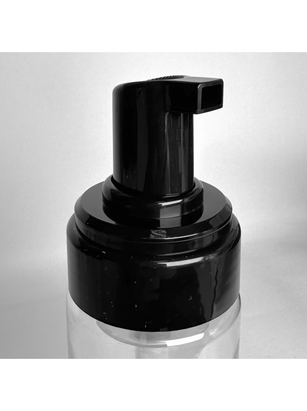 Флакон с пенообразователем, применяется для вспенивания продуктов для умывания, средств для мытья рук, пен для бритья и т.д. Флакон - прозрачный, пенообразователь - черный с чеерным колпаком