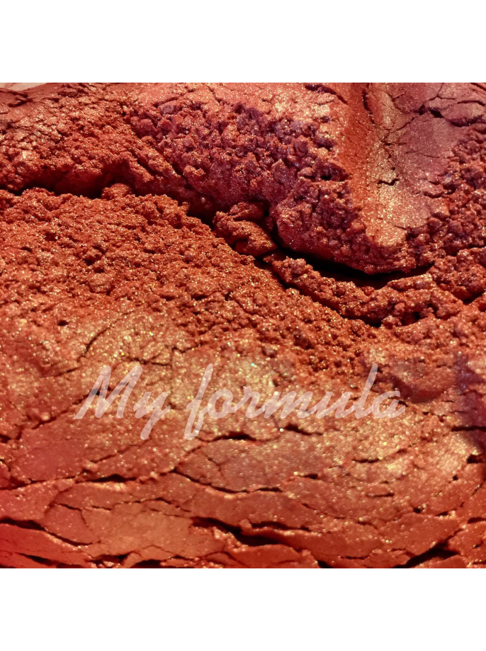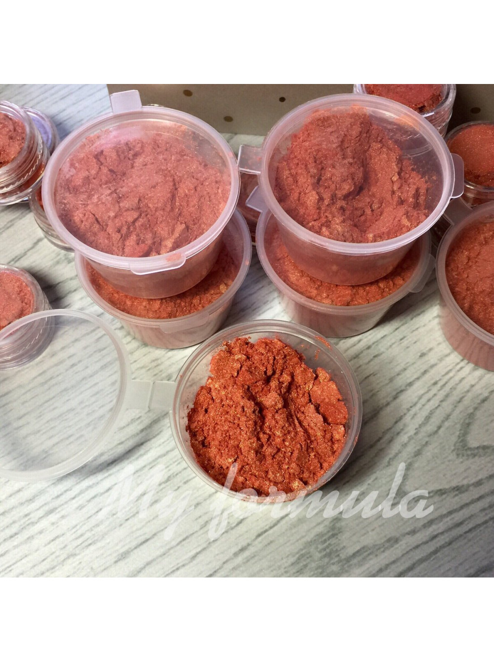Мика красно-оранжевого цвета с зеленым интерферентным оттенком предназначена для декоративной косметики, хорошо подойдет для румян, средств для губ и др.