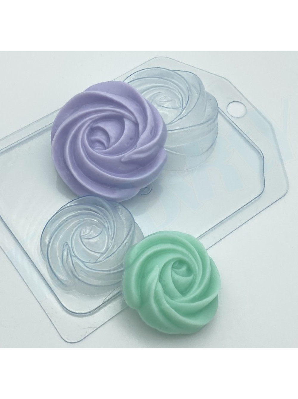На форме расположены две кремовые завитушки, габариты и объем: