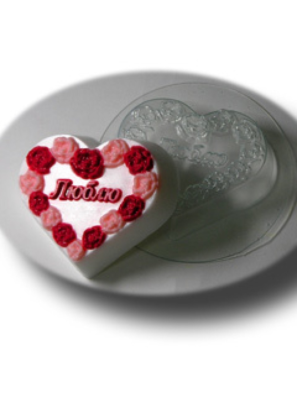 Люблю - форма для мыла ручной работы в виде сердца, украшенного по периметру цветами и надписью в центре Люблю.