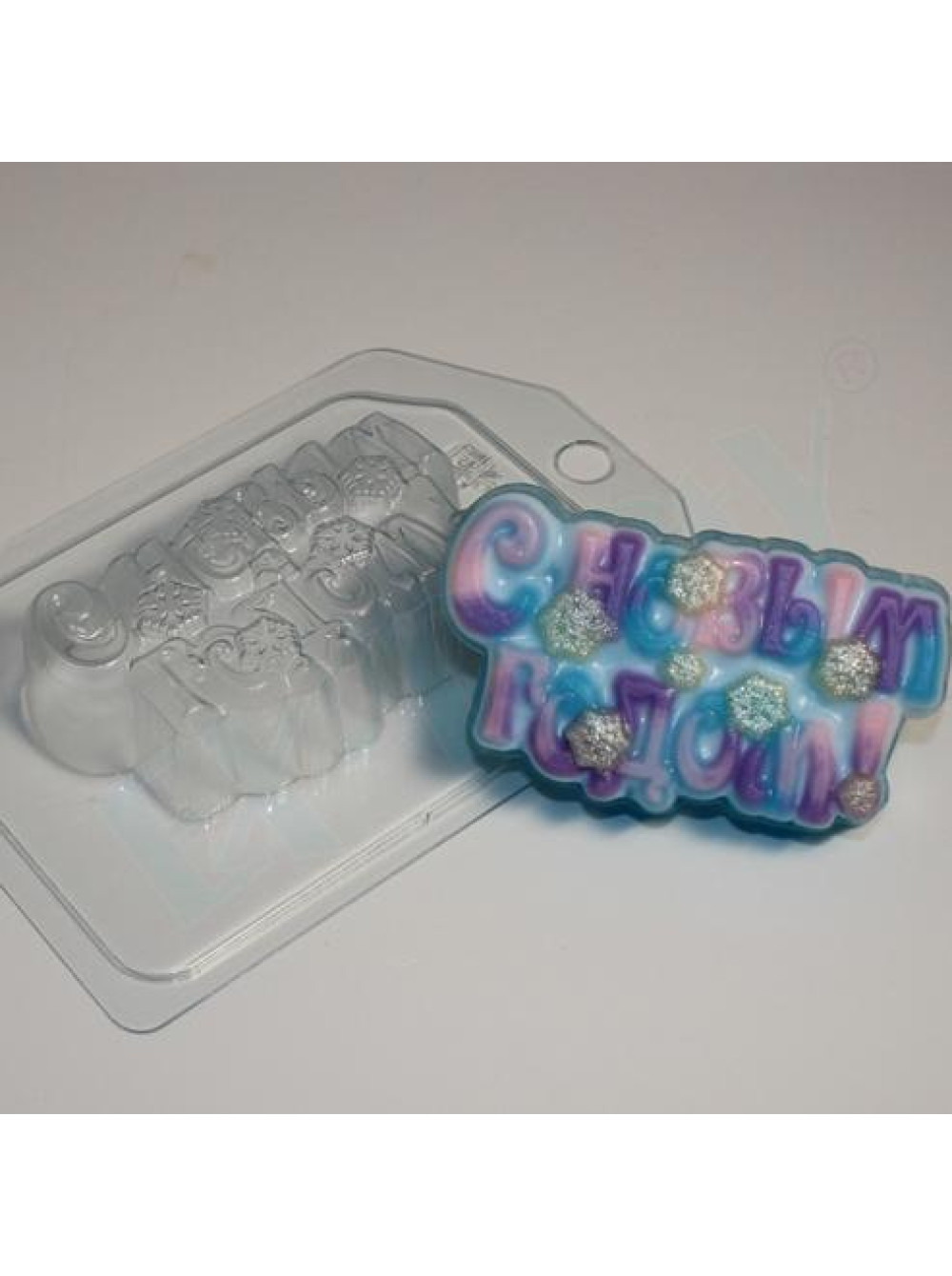Формочка для новогоднего мыла с надписью С новым годом и снежинками.